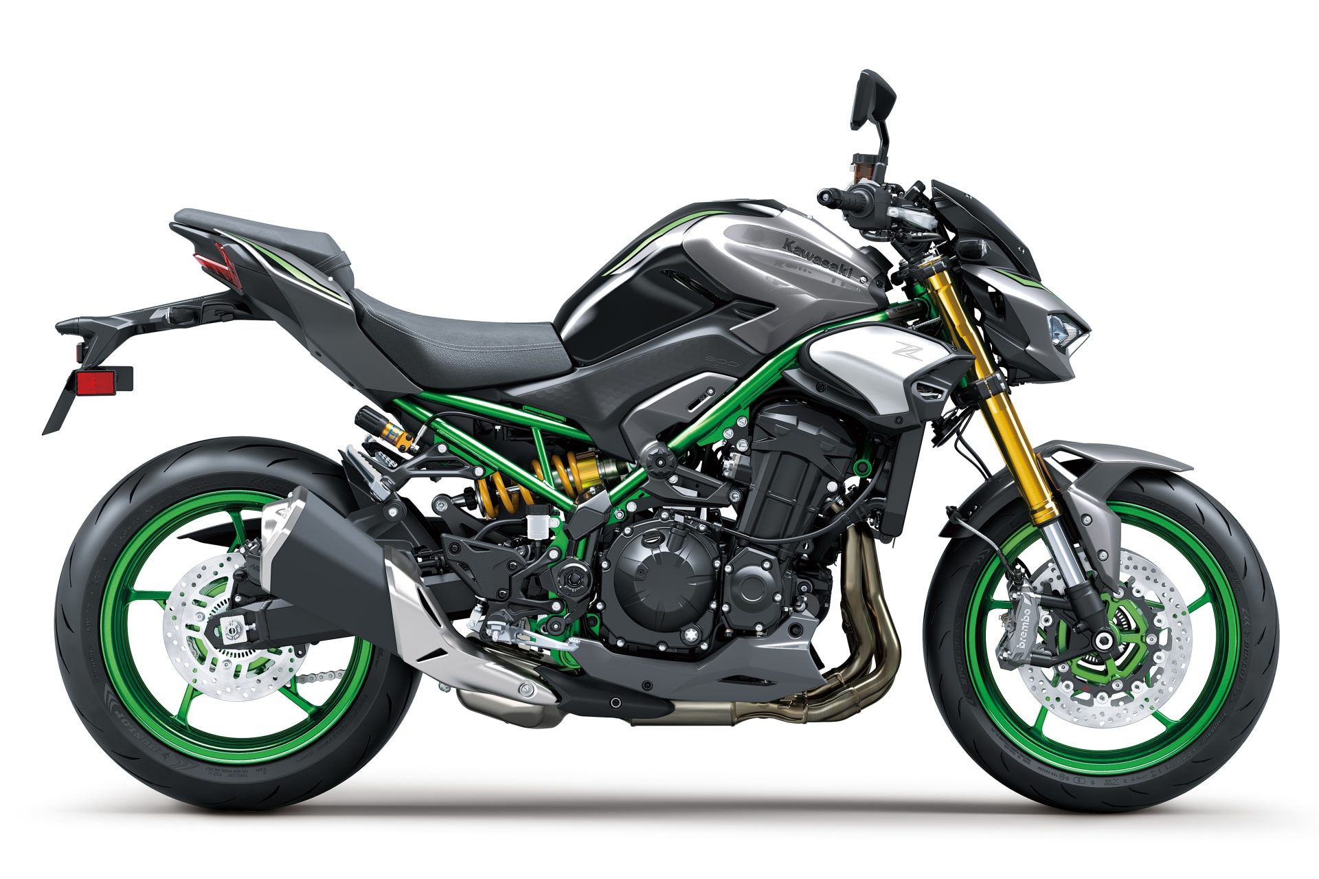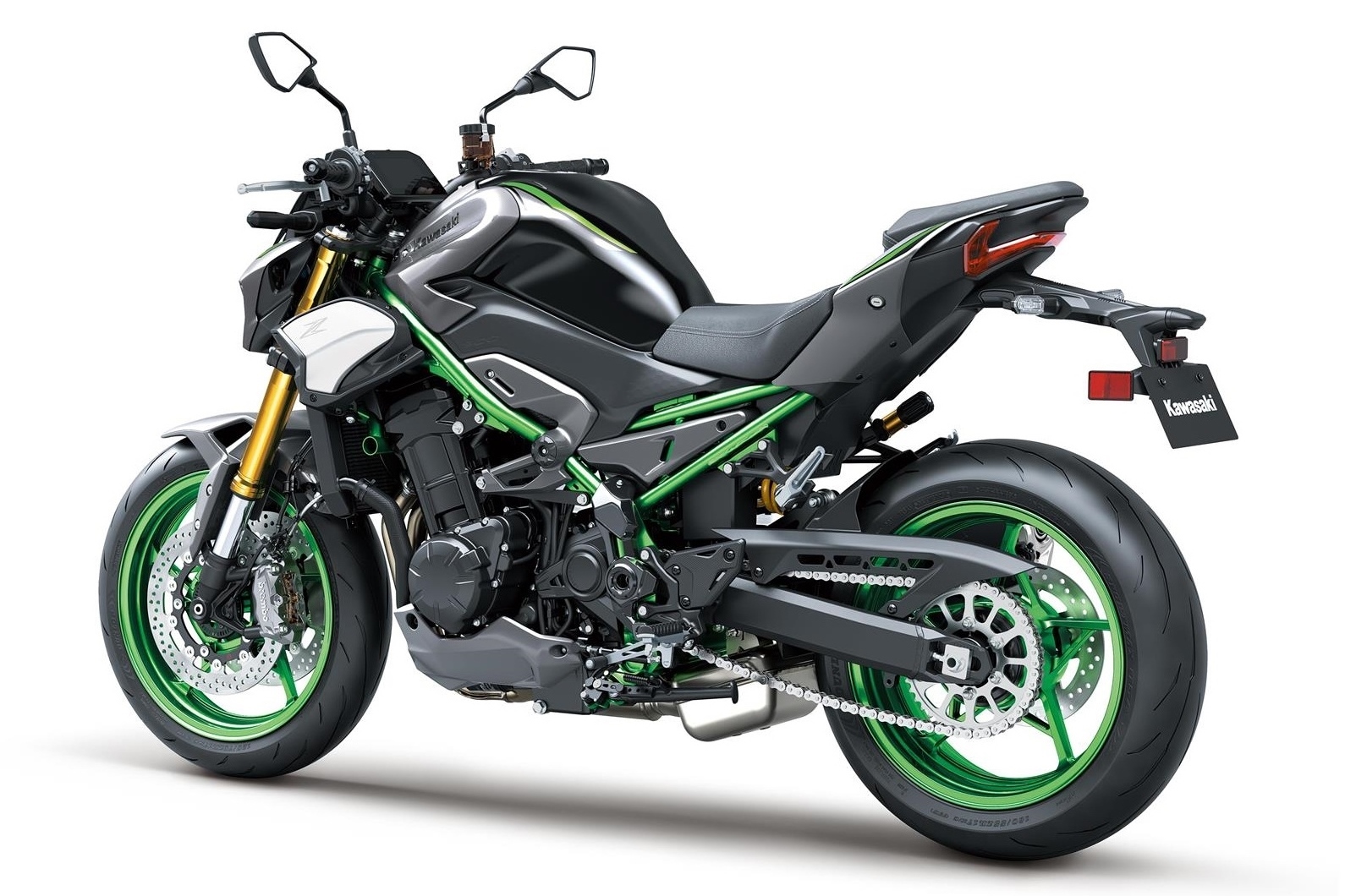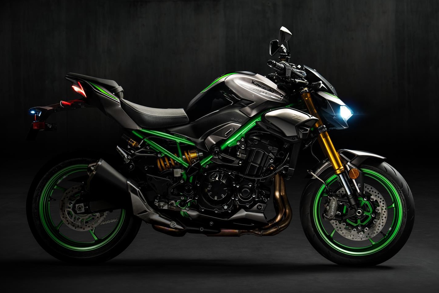 Dari segi dimensi, Z900 SE memiliki ketinggian tempat duduk 810 mm dan berat keseluruhan 214 kg, dengan tangki bahan api berkapasiti 17 liter — cukup untuk tunggangan jauh tanpa kerap mengisi. Reka bentuk ekornya yang padat serta lampu belakang gaya “floating” menambah penampilan moden dan agresif. Warna kombinasi Metallic Matte Graphite Gray / Ebony bersama kerangka Golden Blazed Green menyerlahkan identiti eksklusif varian SE ini.