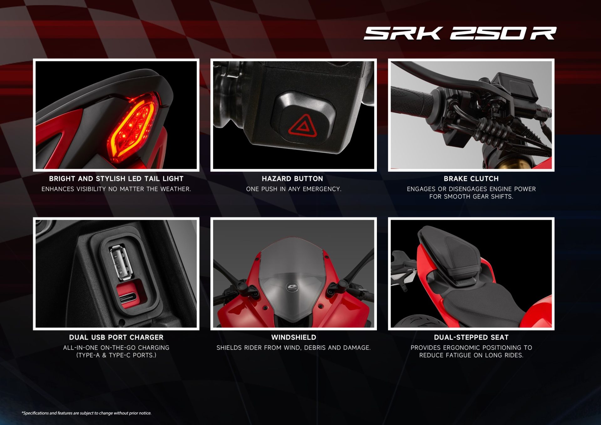 SRK250R juga dilengkapi pelbagai ciri moden yang memperkukuh identiti sportbike masa kini. Ia menawarkan paparan meter digital penuh warna, sistem pencahayaan LED sepenuhnya, dan lampu hazard untuk keselamatan tambahan. Penunggang turut mendapat kemudahan port pengecasan USB Type-A dan Type-C, sesuai bagi memastikan peranti mudah alih sentiasa dicas. Lebih menarik, model ini menyokong sambungan Bluetooth, membolehkan penunggang menerima panggilan telefon dan panggilan WhatsApp terus melalui paparan meter, menjadikannya salah satu sportbike 250cc paling canggih dalam kelasnya.