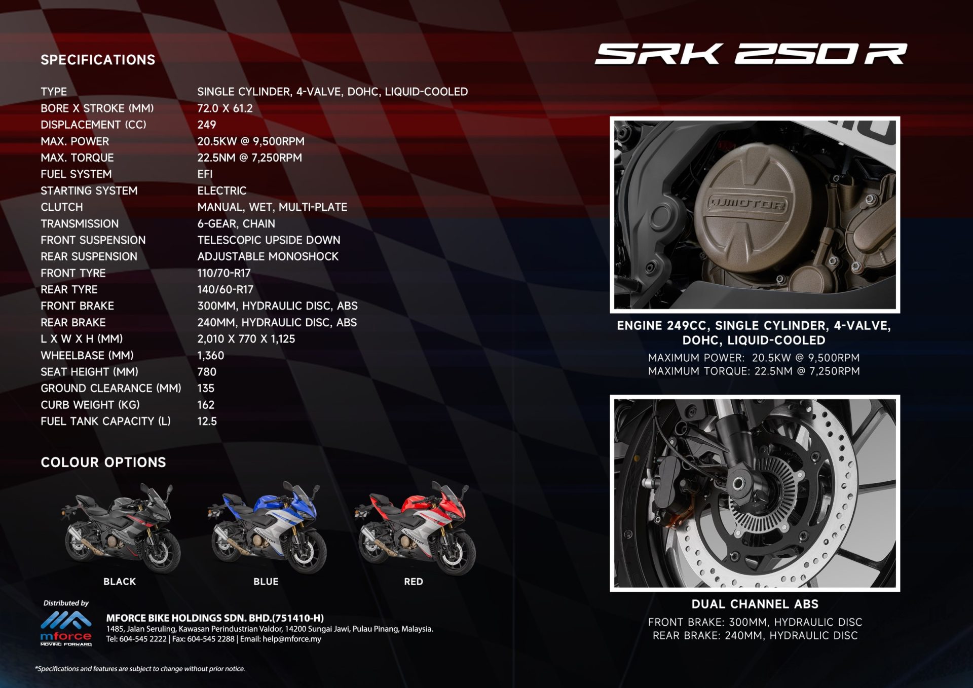 Dengan rekaan aerodinamik yang agresif dan enjin berprestasi tinggi, SRK250R disasarkan untuk penunggang yang menginginkan pengalaman tunggangan sporty dalam pakej 250cc yang ringkas dan praktikal. Ia hadir dalam tiga pilihan warna menarik — Red Silver, Blue, dan Black — yang menonjolkan gaya dan personaliti berbeza di atas jalan. Menariknya, 1,000 pemilik pertama berpeluang mendapatkan SRK250R pada harga pengenalan RM9,988.00, tidak termasuk cukai jalan dan insurans. Tawaran ini menjadikan SRK250R antara sportbike 250cc paling kompetitif dalam segmennya di pasaran tempatan.