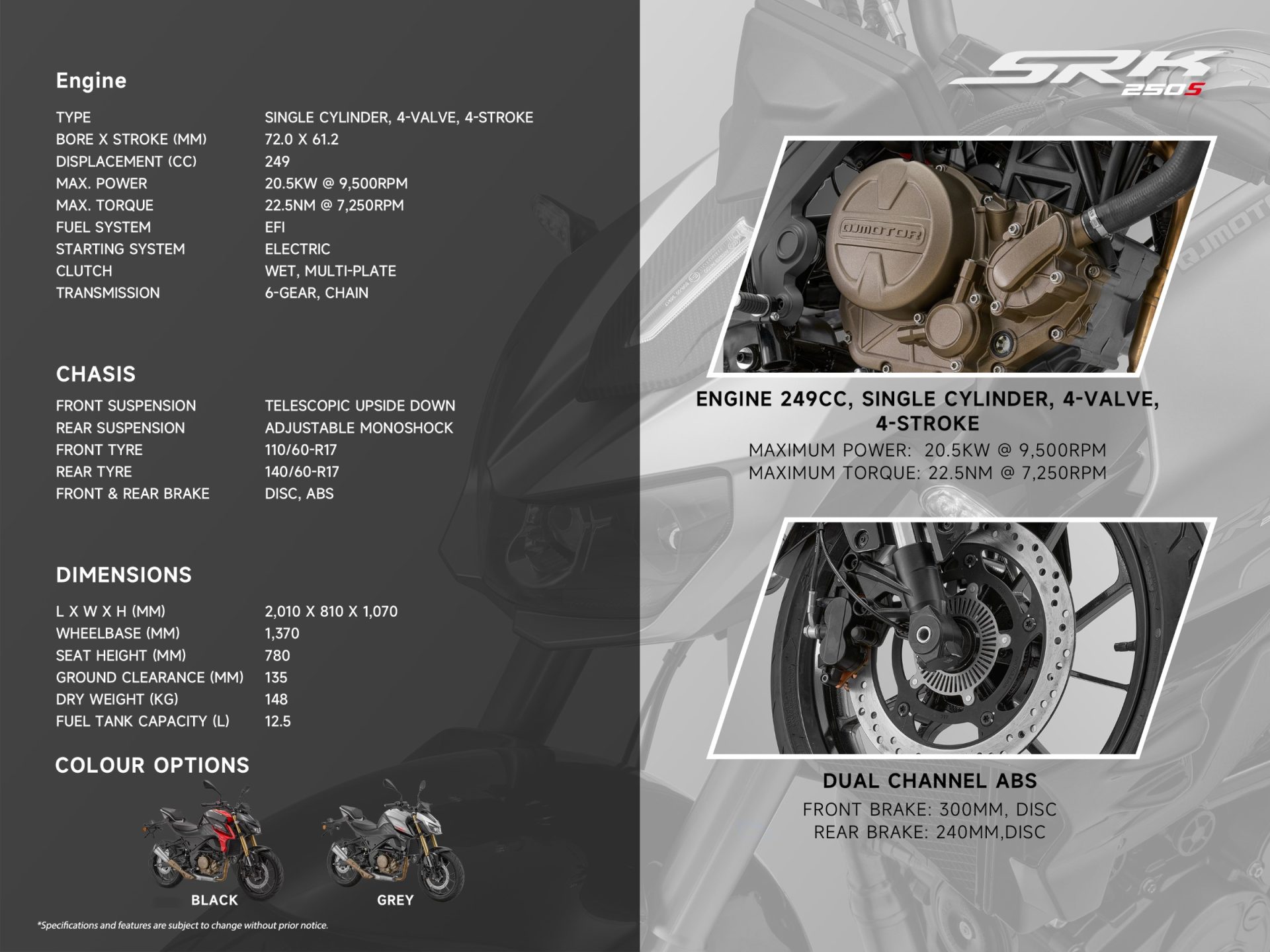 Untuk pasaran Malaysia, QJMOTOR SRK250S ditawarkan pada harga RM9,888.00 (tidak termasuk cukai jalan dan insurans), dengan dua pilihan warna menarik iaitu Black dan Grey. Di bawah rangka sporty ini, SRK250S dikuasakan oleh enjin satu silinder, 4-lejang, 4-injap, 249cc dengan sistem penyejukan cecair. Enjin ini menghasilkan kuasa maksimum 20.5kW pada 9,500rpm dan tork 22.5Nm pada 7,250rpm, digandingkan bersama transmisi 6-kelajuan serta klac basah berbilang plat. Sistem EFI (Electronic Fuel Injection) memastikan pembakaran bahan api lebih cekap dan responsif, manakala sistem penghidupan elektrik memberikan permulaan enjin yang pantas dan mudah.