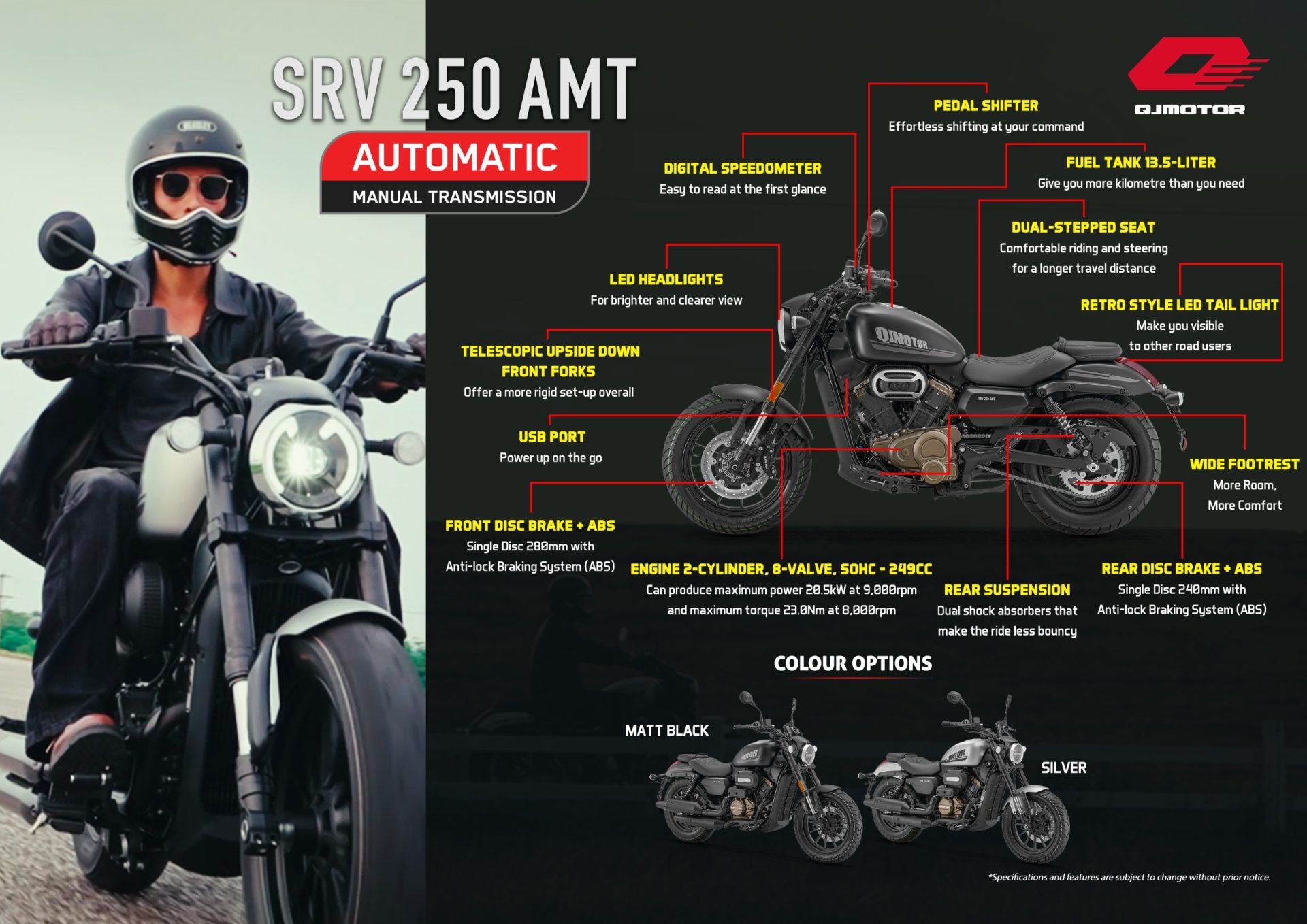 QJMOTOR SRV 250 AMT dibangunkan untuk mereka yang mahukan gaya santai tetapi dengan teknologi moden yang memberi keselesaan dan prestasi dalam satu pakej lengkap. Dengan dua pilihan warna menawan — Silver dan Matt Black, ia menyerlahkan identiti klasik yang digabungkan dengan gaya kontemporari. Harga yang ditawarkan juga cukup menarik, bermula dari RM17,888.00 tidak termasuk cukai jalan dan insurans, menjadikannya antara cruiser paling berbaloi dalam segmennya.