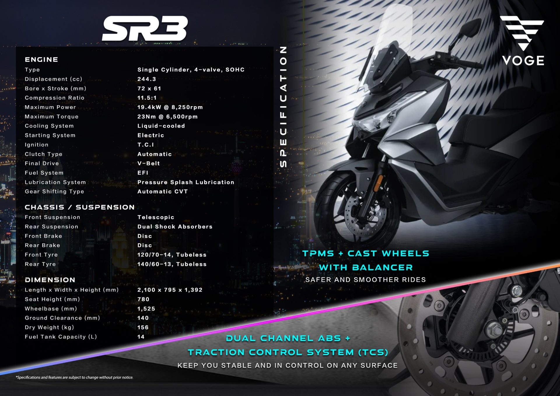 Baru saja diperkenalkan di pasaran Malaysia dengan harga RM15,888 (tidak termasuk cukai jalan dan insurans), Voge SR3 2025 hadir dalam tiga warna yang tampak premium — White, Silver, dan Grey. Setiap warna membawa karakter tersendiri; putih untuk yang elegan, perak untuk yang berjiwa urban, dan kelabu untuk yang suka gaya maskulin dan matang.