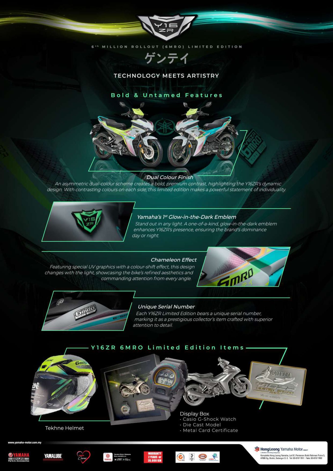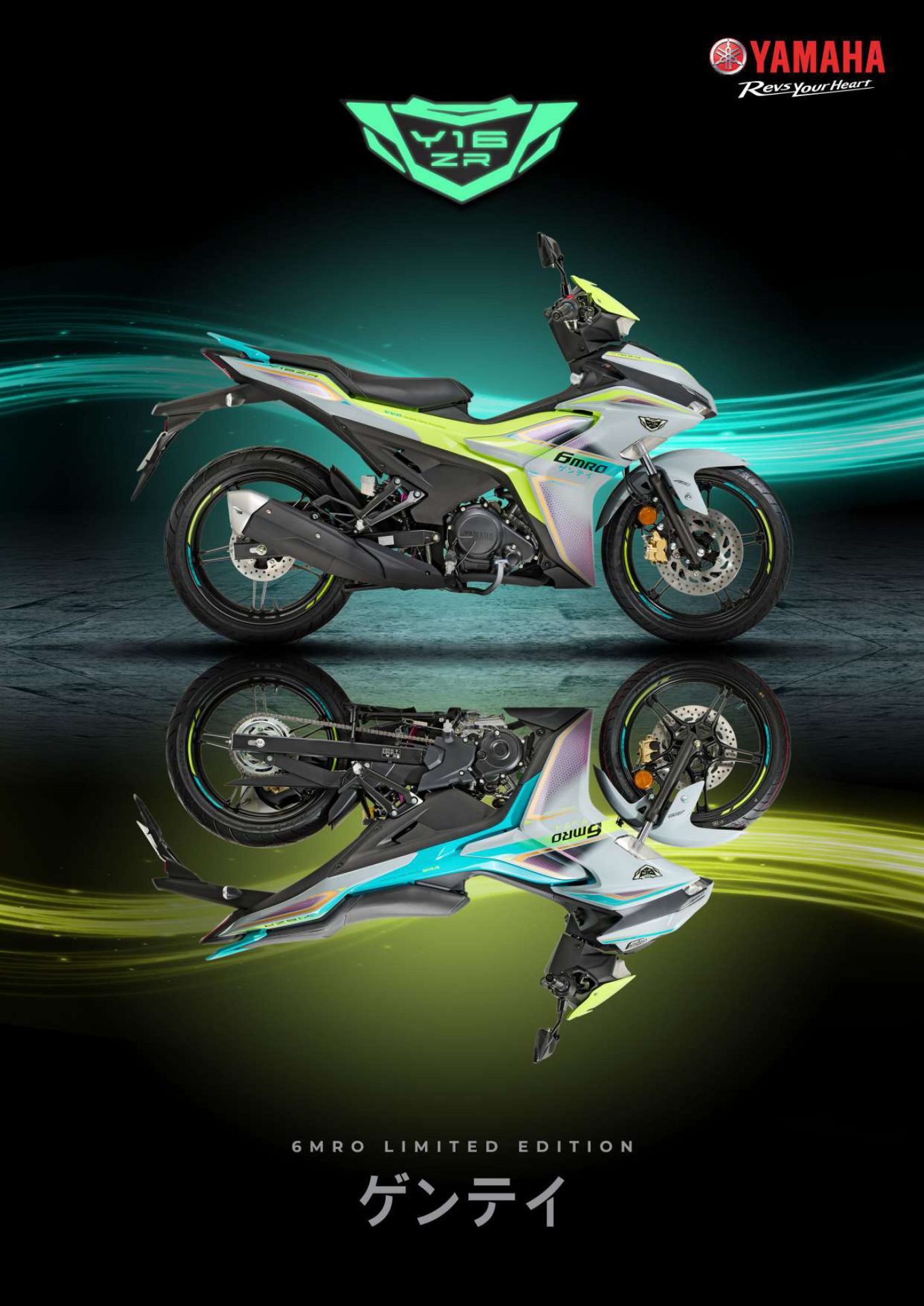 Reka bentuknya turut diserikan dengan grafik khas kesan “chameleon” yang berubah warna mengikut cahaya. Efek ini memberikan dimensi visual yang menakjubkan, menjadikan setiap sudut pandang motosikal ini tampil hidup dan penuh tenaga. Untuk melengkapkan nilai koleksi, setiap unit Y16ZR 6MRO diberikan nombor siri unik, melambangkan statusnya sebagai barangan eksklusif yang dihasilkan dengan ketelitian tinggi.